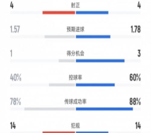 熱刺vs水晶宮數(shù)據(jù):射門12比9、進(jìn)球機(jī)會(huì)1比3、控球率40%比60%