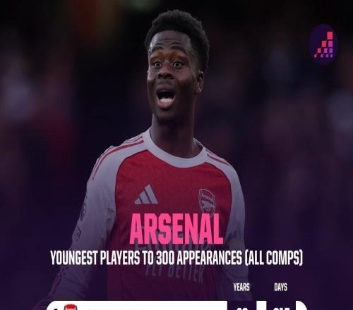 24歲180天,薩卡是達成阿森納生涯300場第四年輕的球員